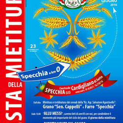 L’Azienda Agricola Salvatore Agostinello di Specchia domenica 26 giugno, a partire dalle ore 9.00 presso la località Cardigliano di Sotto (Google Maps 39.956821 - 18.258718) organizza la Festa della mietitura, con la partecipazione del Parco naturale regionale Costa Otranto-Santa Maria di Leuca e Bosco di Tricase e il patrocinio del Comune di Specchia.